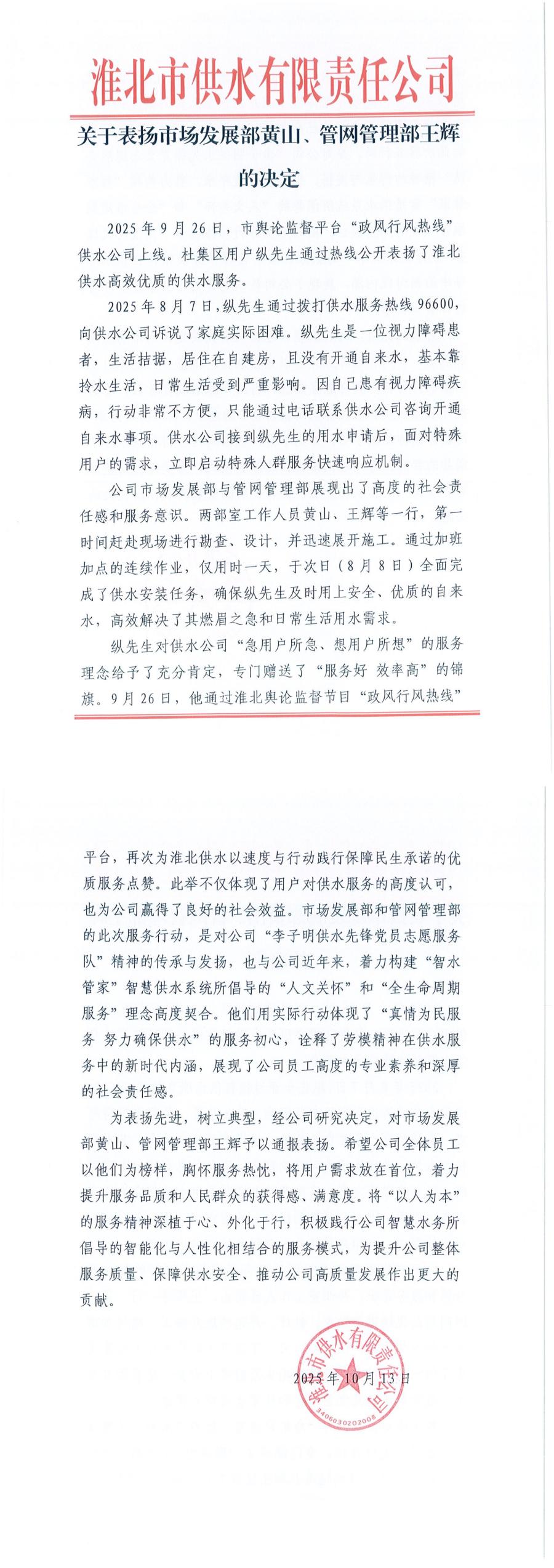 關(guān)于表揚(yáng)市場(chǎng)發(fā)展部黃山、管網(wǎng)管理部王輝的決定